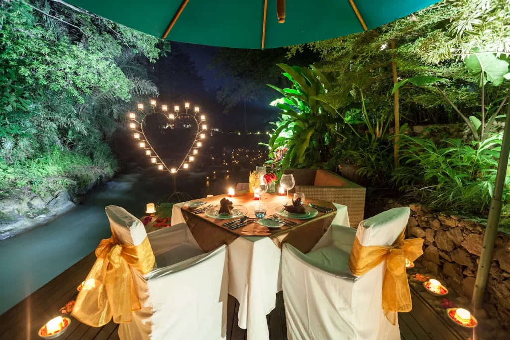Restoran ini menawarkan candle light dinner privat di tepi Sungai Ayung, Ubud. Suasana alam yang tenang, suara aliran sungai, dan dekorasi lilin menciptakan pengalaman yang sangat intim. Swept Away sering dipilih pasangan yang menginginkan private romantic dinner dengan nuansa alam.